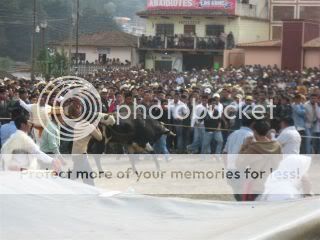 Depois de 3 dias a saltar de festa em festa a dar paleio a mais um grupo de bêbados amigos, voltei a San Cristobal para ver a tourada do ultimo dia de festa em Chamula. Os touros são soltos na praça principal e desafiados pelos mais corajosos até que o touro se canse. Eu pensei em mandar a bicicleta lá para dentro, mas esta tourada era só para amadores.