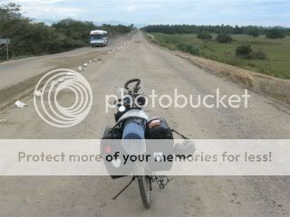 Desta vez com muito mais medo desato as cordas e levanto a bicicleta. Pareceu-me que estava tudo partido e o meu primeiro pensamento foi que podia arrumar as malas e ir para casa, a viagem chegou ao fim, mas uma melhor inspecção prova que a situação era menos grave do que parecia, estavam muitas coisas entortadas, arranhadas, e deslocadas, mas havia poucas partidas e nada que eu não pudesse arranjar. Com um bocadinho de paciência e depois de juntar as minhas malas que ficaram espalhadas na estrada, endireito o melhor que posso o guarda lamas e as engrenagens dianteiras (coroas), alinho o guiador, recomponho a corrente, tiro o cabo dos travões da frente que estavam a roçar no aro e sacudo-lhe o pó, o suficiente para continuar ate Puerto Escondido.